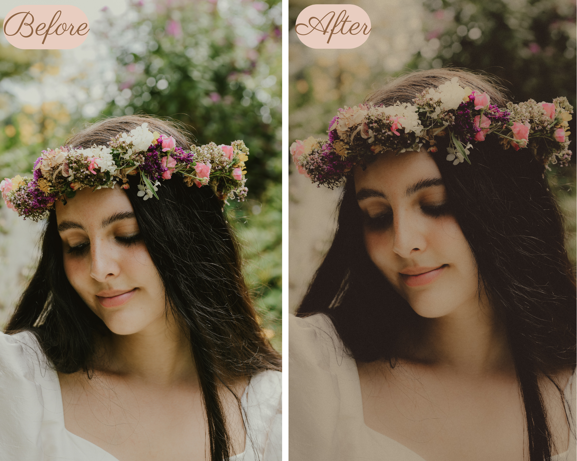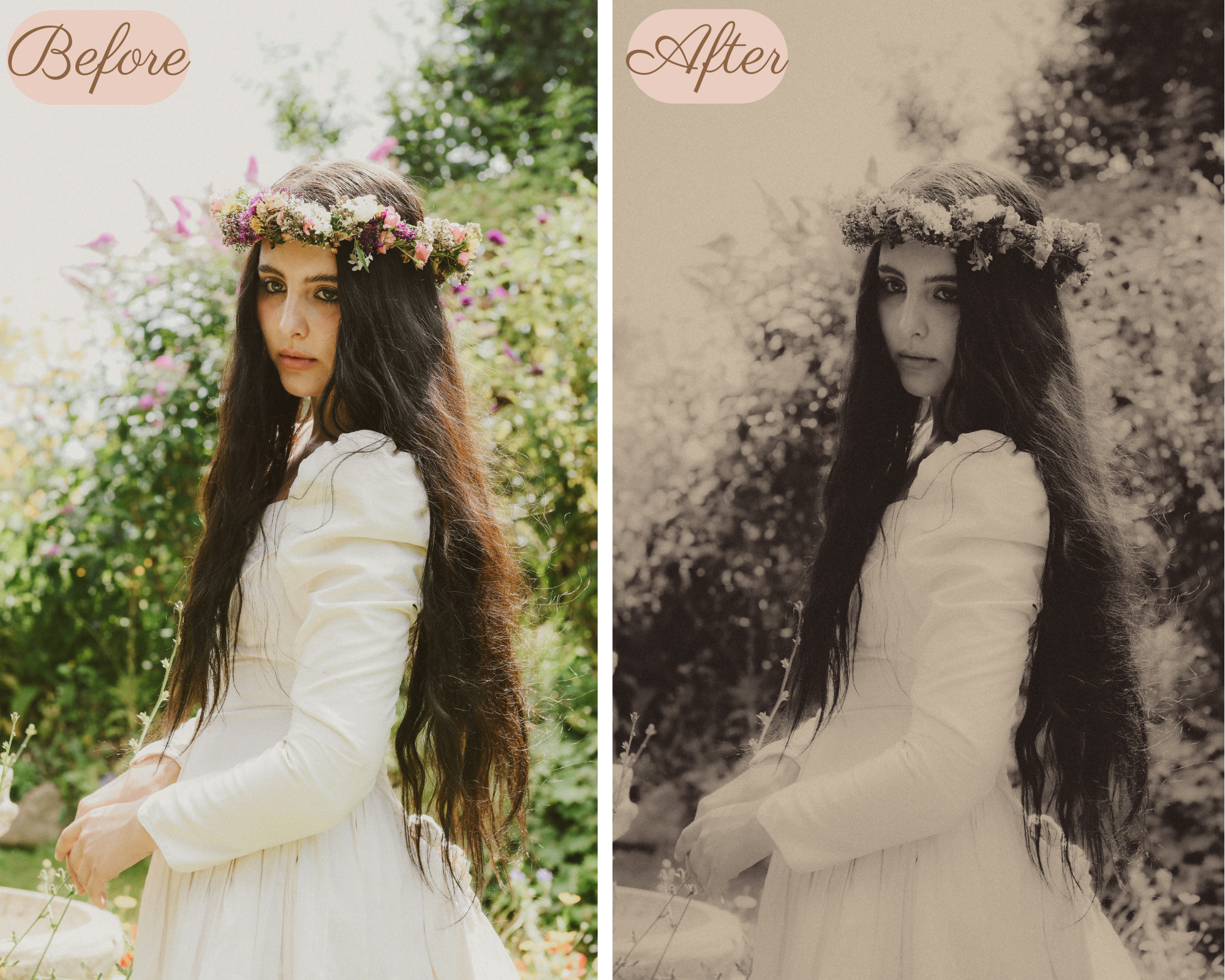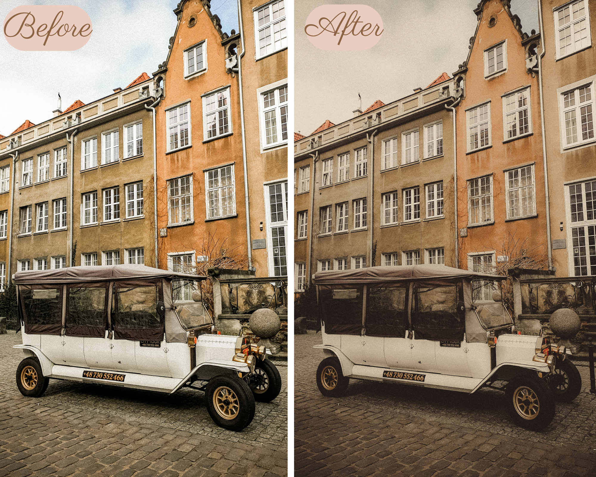 This preset will give your images a soft vintage look. Please note that the preset can vary from image to image so please be aware that some adjustments need to be made, for example the brightness.
